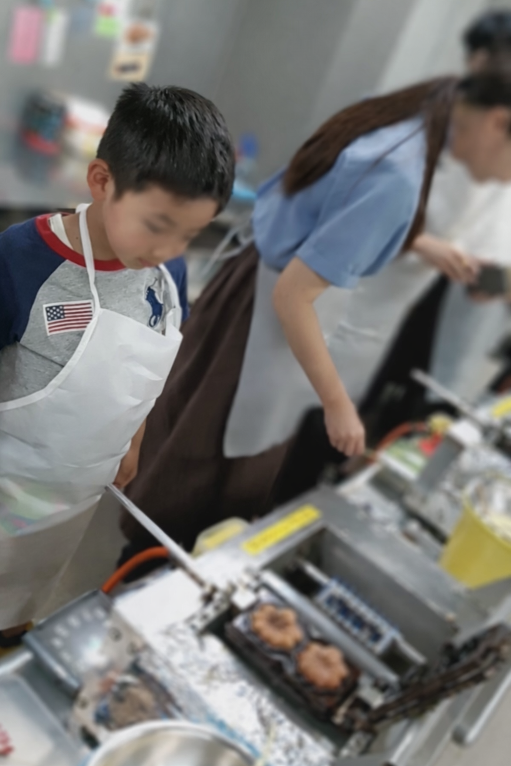 子ども達2人の参加として、私達夫婦は付き添いにしました。妻が料理サポート、私が撮影で上の子から順番に調理することにしました。司会の指示に従って手焼きのもみじ饅頭焼き機を使用して調理します。この機械くるくる回転してひっくり返したり、スライドして2個のもみじ饅頭を焼くことができるようになっています。