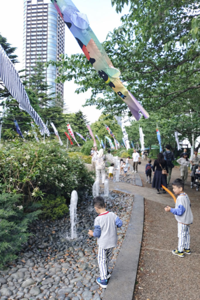 その後六本木に移動し、ミッドタウンに向かいます。水が噴き出している箇所があり、気候も良くなってきたので、プチ水遊びを行います。上を見上げるとカラフルなこいのぼりがあり、季節を感じられます。