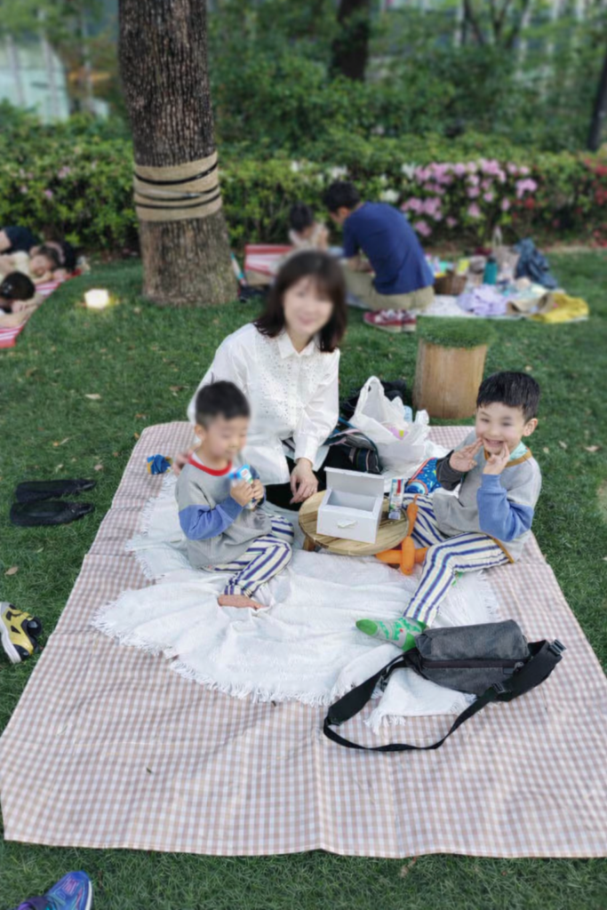 どんどん奥に入っていくと、皆レジャーシートをひいてくつろいでいます。ピクニックシートを借りることができるブースがあり、私達も借りることにしました。