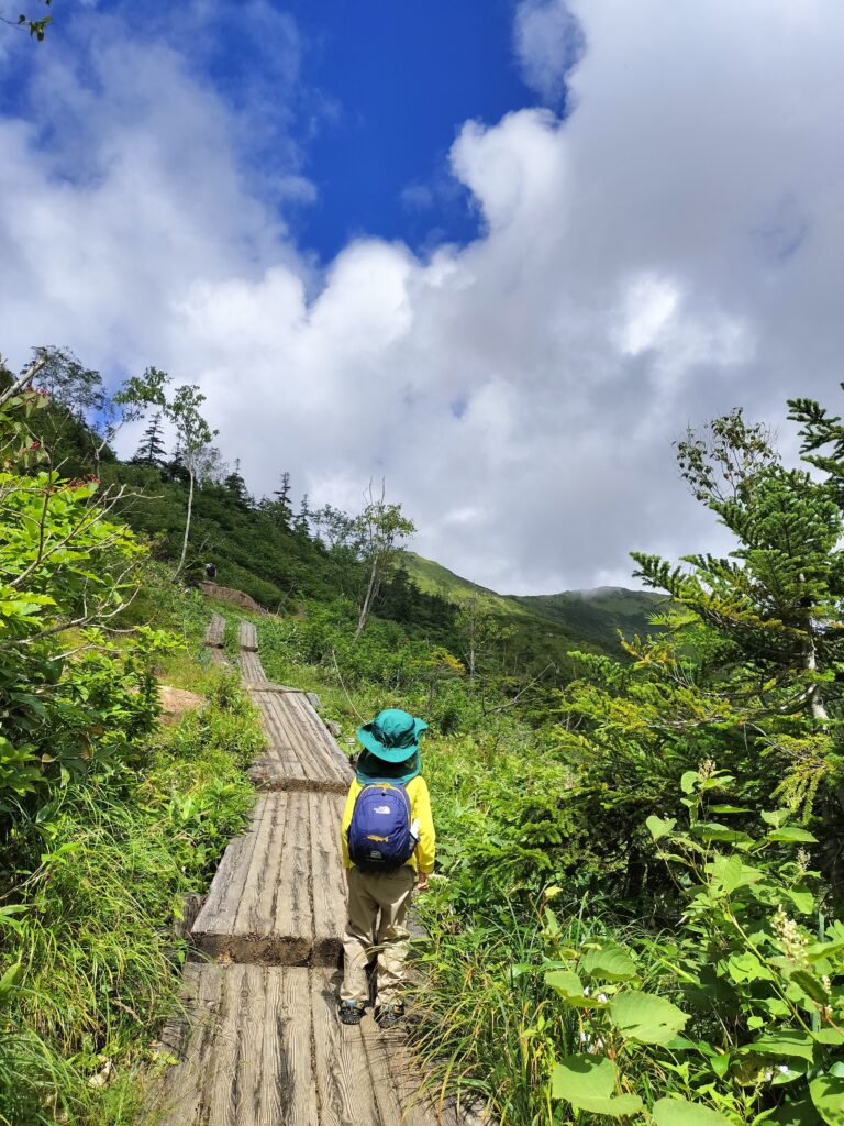 そしてふと「この向こうに山小屋があるの?」と聞いてきます。「いや、まず山に登って、その後戻ってきて、山小屋に行く。」と伝えると驚いた顔で「そのまま山小屋に行けばいいじゃん」と言い始めました。今回事前に説明するのに至仏山というより山小屋で興味を持たせていたのが仇となった形です。「でもまずこの山に登りたい。」と伝えますが、途中でふざけて一人で山を下りるふりをしたり、納得できない様子。