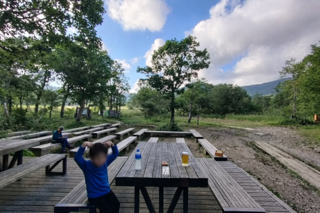至仏山荘に着くと、アクエリアスとビールで乾杯!!至仏山には登れなかったけど息子との幸せな時間を過ごします。