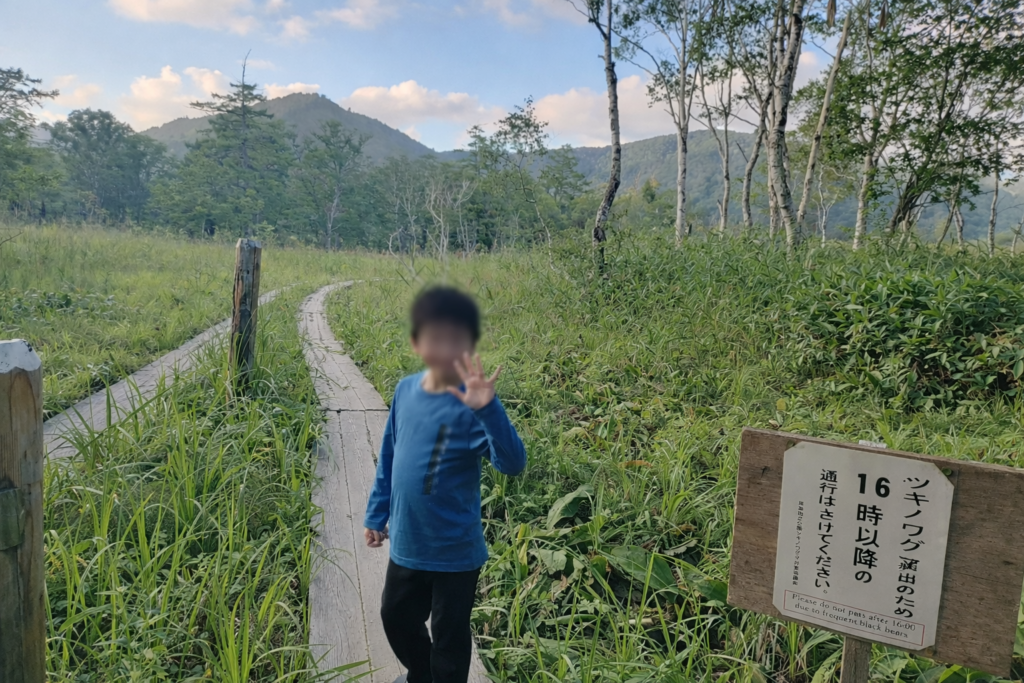 その後山ノ鼻を散策。日暮れ前くらいに山ノ鼻の出口あたりに来ると「ツキノワグマ頻出のため16時以降の通行はさけてください」と看板がありました。子どもと何度もツキノワグマいないか確認しますが、さすがに見当たらず。子どもは残念そうでした。こちらは至仏山登るの諦めて良かったと実感していました。尾瀬は本当に出そうな雰囲気です。
