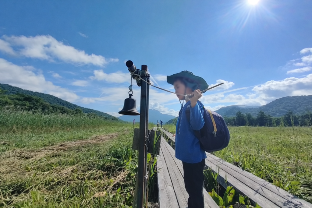 すっかり機嫌が良くなった我が子は向こうから来る登山者全員に挨拶をし、「もう少しで着くから」「頑張って」「あと10分」とかアドバイスをし始める始末。山だからか全員相手をしてくれるので、さらにご機嫌になっていました。途中に熊避けの鐘があり、子どもはそれを叩いて喜んでいました。