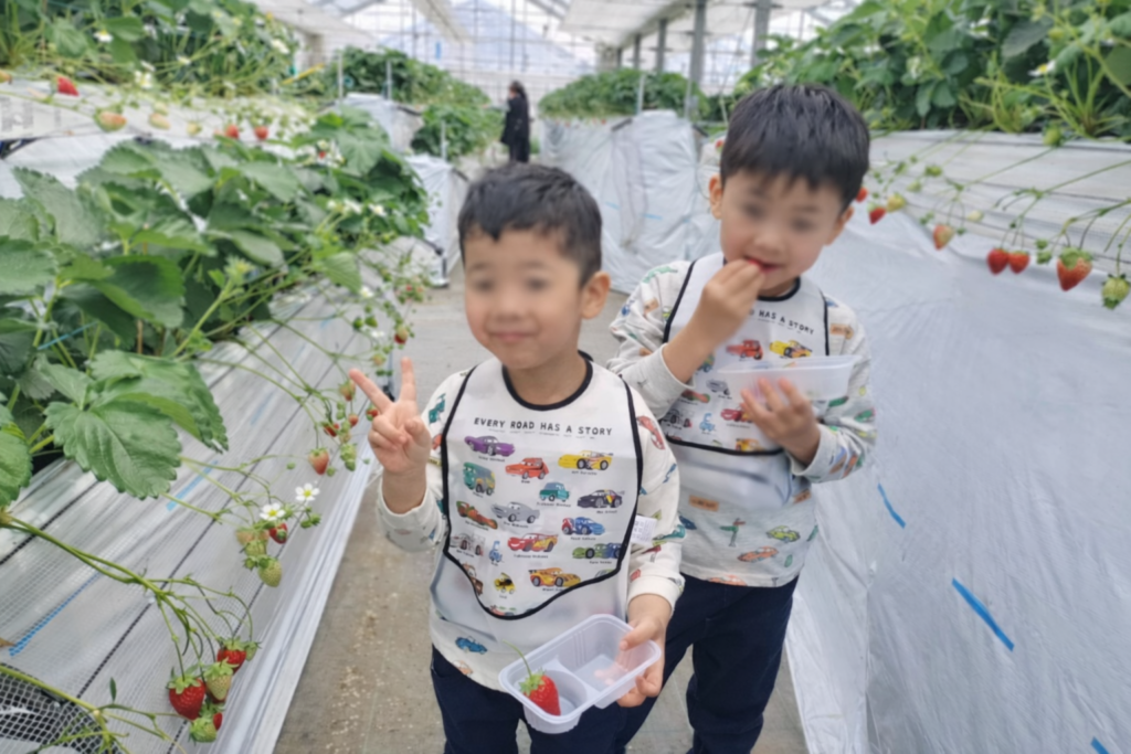 越谷いちごタウンの中はビニルハウスが複数あり、場所によって様々な種類のいちごがあるため、移動しながら45分いちご狩りを行います。子ども達はすぐにいちごの汁を服に付けてしまうので、保育園で使うような食事用のプラスチックエプロンを付けて回ります。子ども達はいちごを取っては食べる係、私と妻がスマホで写真を撮る係になってイチゴ狩りを遂行しました。ビニルハウスにはいちごを食べるための椅子や机もあり、子ども達はそこで大量のいちごを味わって、次のビニルハウスに移動の繰り返しを行います。45分程食べているとさすがにもういいかという気分になってくるのでそこで終了です。