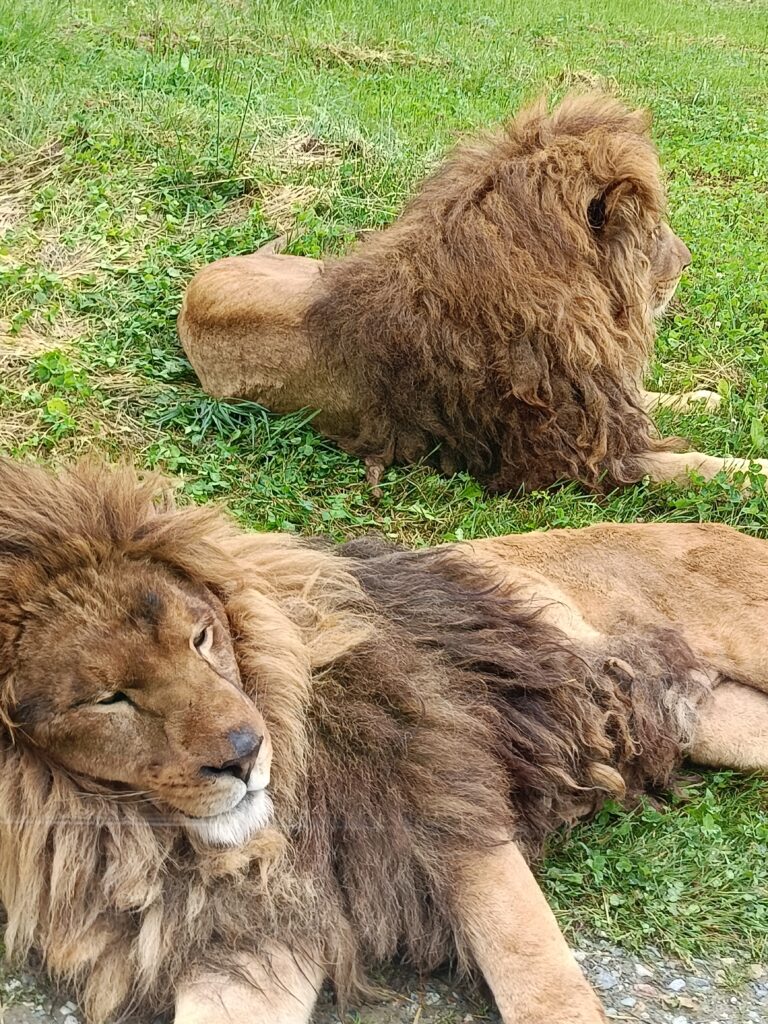 子ども達はバスに乗ることで既に嬉しそう。猛獣エリアを進みます。ホワイトライオンは珍しいらしいですが、少し見にくい位置にいたので残念でしたが、結構な数のライオンが道端で寝そべっているすぐ横をバスが通過するのはサファリならでは。