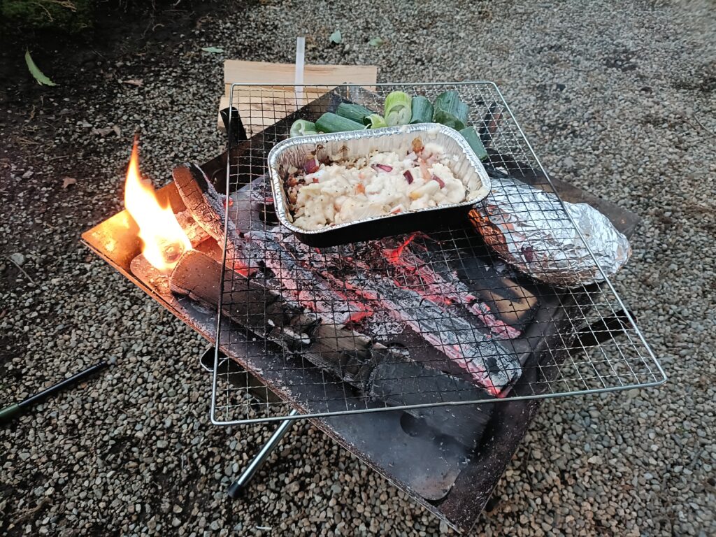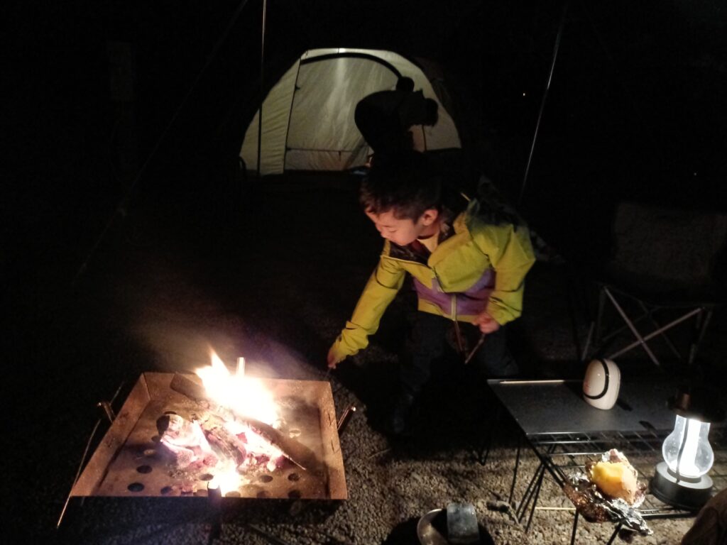その後テントに戻ると焚火台に火をおこして晩御飯の準備です。家から持ってきたお肉と管理棟にキャンプ場オリジナルと思われる食材があったため少し増強して調理しました。さすがに焚火をしても無謀に火に突っ込まなくなった我が子たちを見て成長したなと安心して調理できました。晩御飯はいつも通りの焼肉にしました。「ふたりソロキャンプ」という漫画に出ていたタンドリーチキンが子ども達には結構人気でした。事前に下ごしらえしたかいがあり良かった。