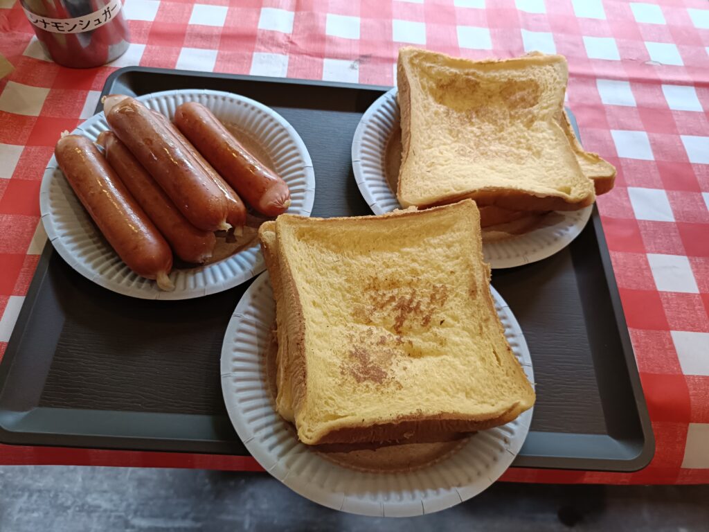 1人100円の朝食サービスがこのキャンプ場あるため、朝食はそれを頂きます。フレンチトースト、ソーセージ、珈琲、コンソメスープ。ソーセージはやたらジューシーでした。