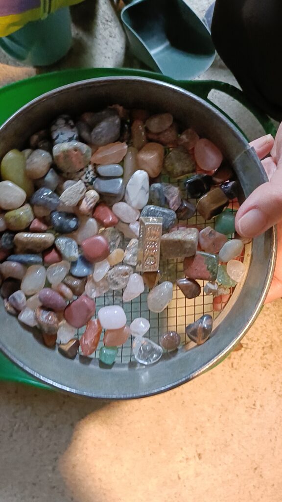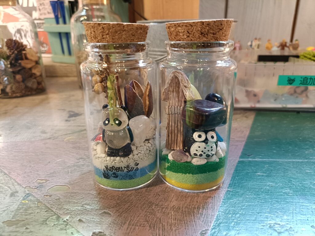 で、次が瓶詰めに参加。瓶にカラフルな砂を入れた後に、先程取ってきた宝石やパンダ、フクロウの作り物を入れて蓋をし、完成。