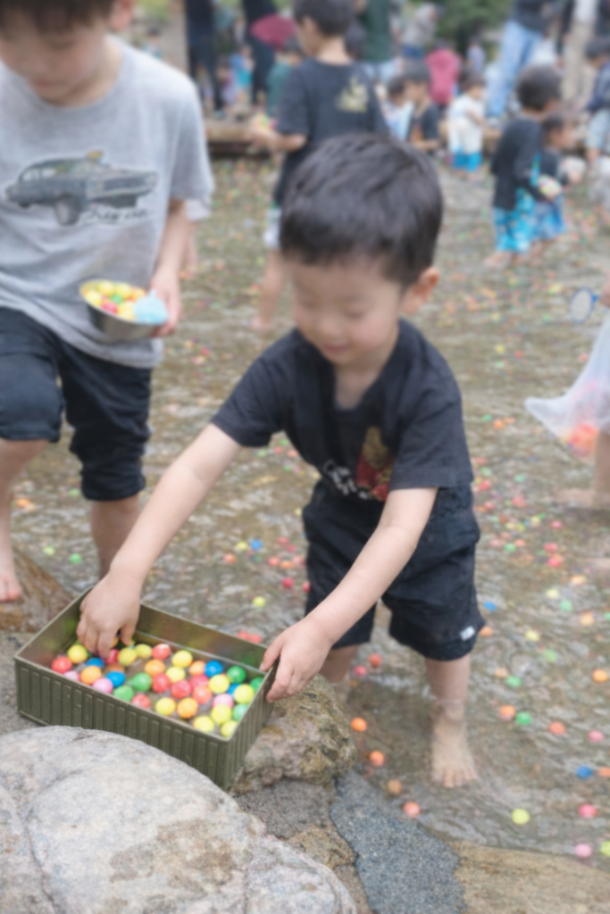 そうこうしていると妻がイベントがあると言い出し、管理棟方面の池に行くと子ども達が集まっています。従業員が池にスーパーボールを放り込みそれを子ども達がすくい上げます。全員必死。しかし子供の数すごいなと思いました。結局大量のスーパーボールを家から持ってきた箱に入れて子ども達は満足しました。
