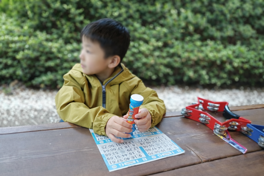 よし終わったかと思ったら次はビンゴがあるとのこと。シートを購入し久しぶりに家族でビンゴゲームに参加します。タンバリンをもらい、盛り上げますが、残念ながら3歳には早かったようで途中で下の子は飽きてしまいました。そして残念ながら当たらなかったが、最初に当たった人は子供用の自転車など結構豪華な賞品が出ていたようです。