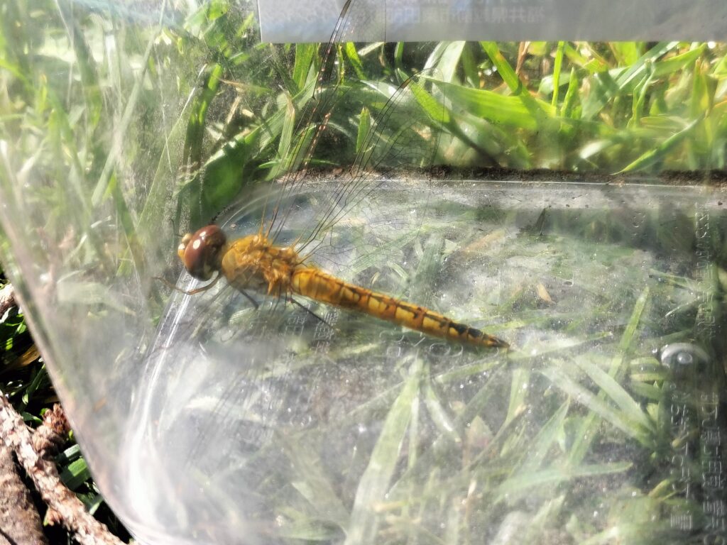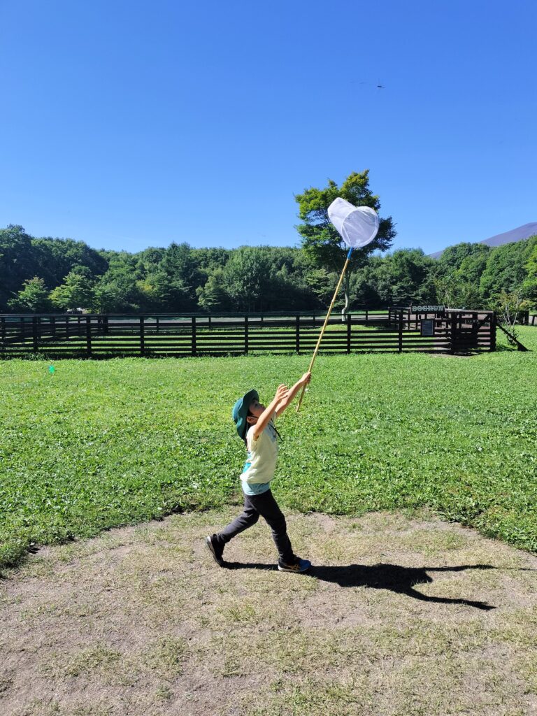 昨日キャンプファイヤーで盛り上がった多目的広場には大量のトンボがいてそれを捕まえて遊びました。子ども達は虫かごのトンボを見て大満足。