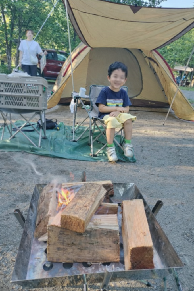 一度テントに戻ってきて、晩御飯は焼肉パーティーです。子ども達は焚火台の周りに椅子に座ってくつろぎます。