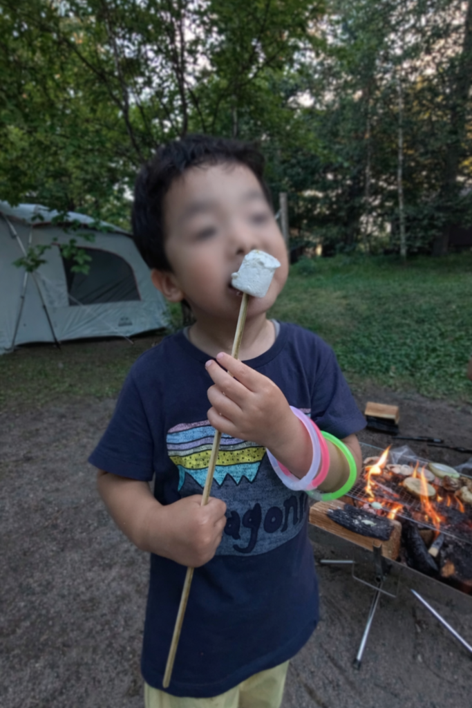 19時から今回の目玉、キャンプファイヤーです。キャンプ場の奥に多目的広場があり、そこには焚火用の木材の周りに人が集まっています。こんなにいるのかというくらい子どももいます。日が暮れ途中でインディアンの酋長が現れ、大盛り上がり。そして点火され、焚火の周りでキャンプだホイで盛り上がります。他にも「インディアンさん‼」「なんですかー」「あんなこんなことできますか」という掛け声のともに変な恰好をして皆大喜び。最後下の子は疲れて抱っこになり寝てしまいましたが、まあ盛り上がっていました。ちなみに家に帰ってからも我が家では「インディアンさーん」のくだりが長期間流行りました。